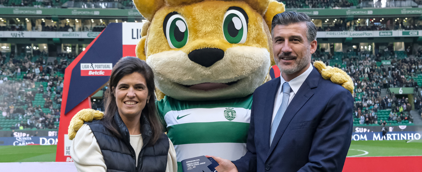 Foi em pleno relvado de Alvalade que Inês Maia Sêco, coordenadora executiva da Fundação Sporting, recebeu de Nélson Pereira o Prémio de Responsabilidade Social de janeiro, atribuído pelo Conselho de Administração da Fundação do Futebol – Liga Portugal à iniciativa “Leões na Academia do Johnson”. Em dia de jogo do Sporting CP com o SC Farense, relativo à jornada 24 da Liga Portugal Betclic, houve mais um motivo de aplauso para quem esteve na bancada.