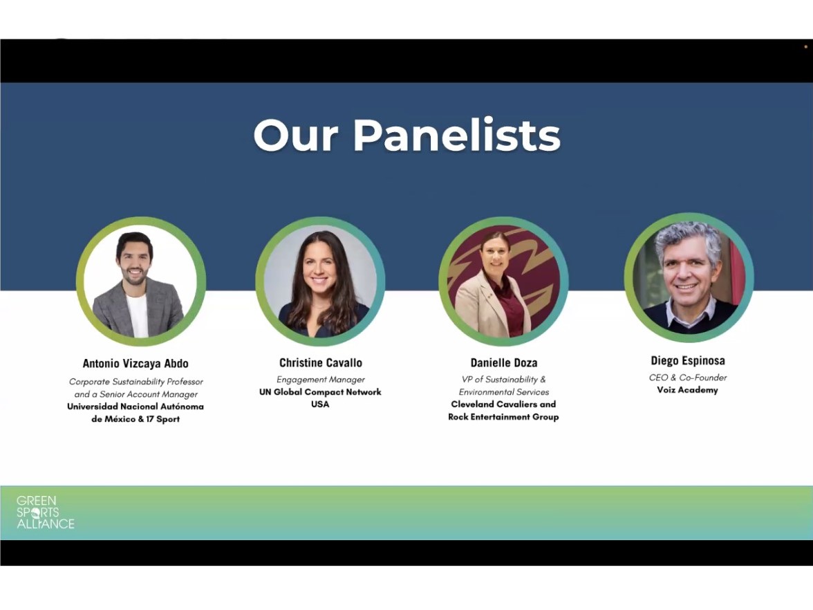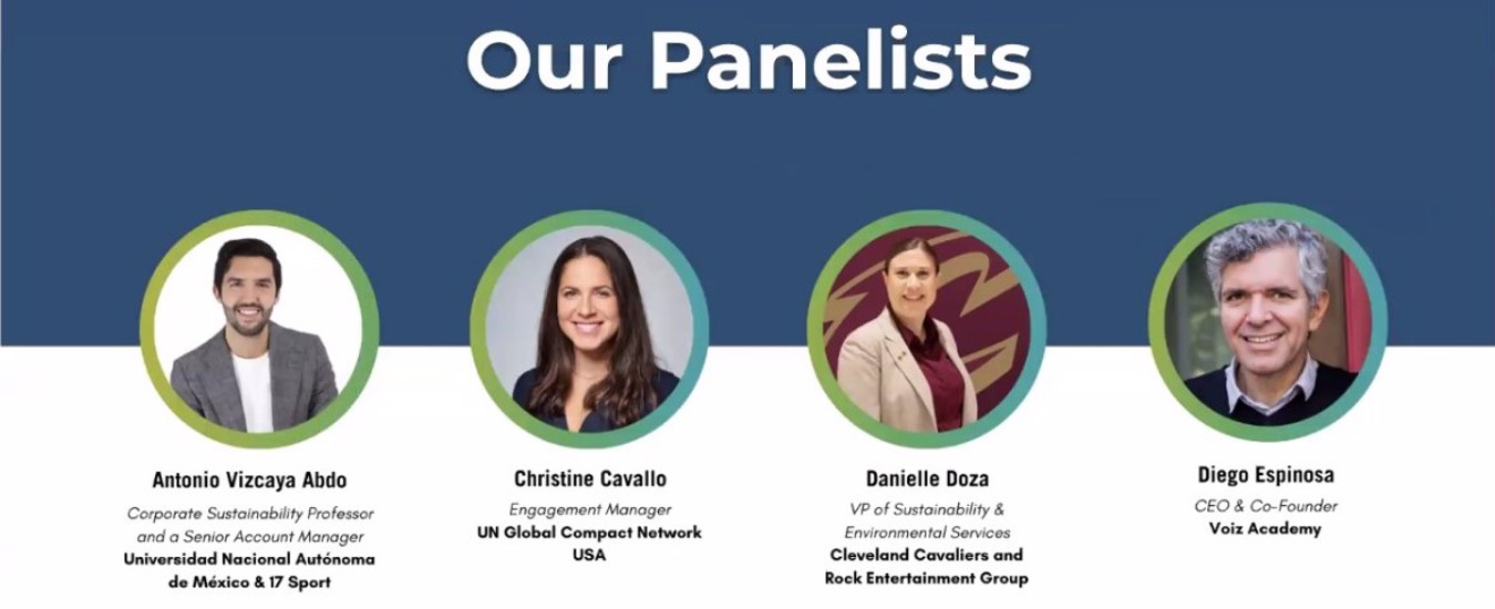 O painel, moderado por Diego Espinosa (CEO & Co-Founder da Voiz Academy), contou com intervenções de Danielle Doza (VP of Sustainabilty & Environmental Services – Cleveland Cavaliers e Rock Entertainment Group), Antonio Vizcaya Abdo (Corporate Sustainabilty Professor and Senior Account Manager – Universidad Nacional Autónoma de México & 17 Sport) e Christine Cavallo (Engagement Manager – UN Global Compact Network USA). Os oradores exploraram estratégias inovadoras que transformam a sustentabilidade numa ferramenta geradora de impacto e retorno financeiro, sublinhando a crescente importância deste tema no contexto desportivo global.